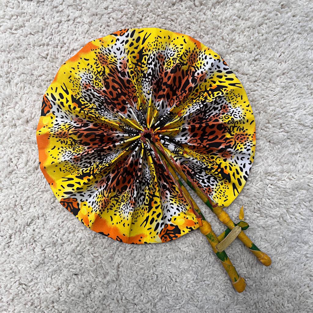 African Print Circle Foldable Handheld Fan - Yellow / Orange / Brown